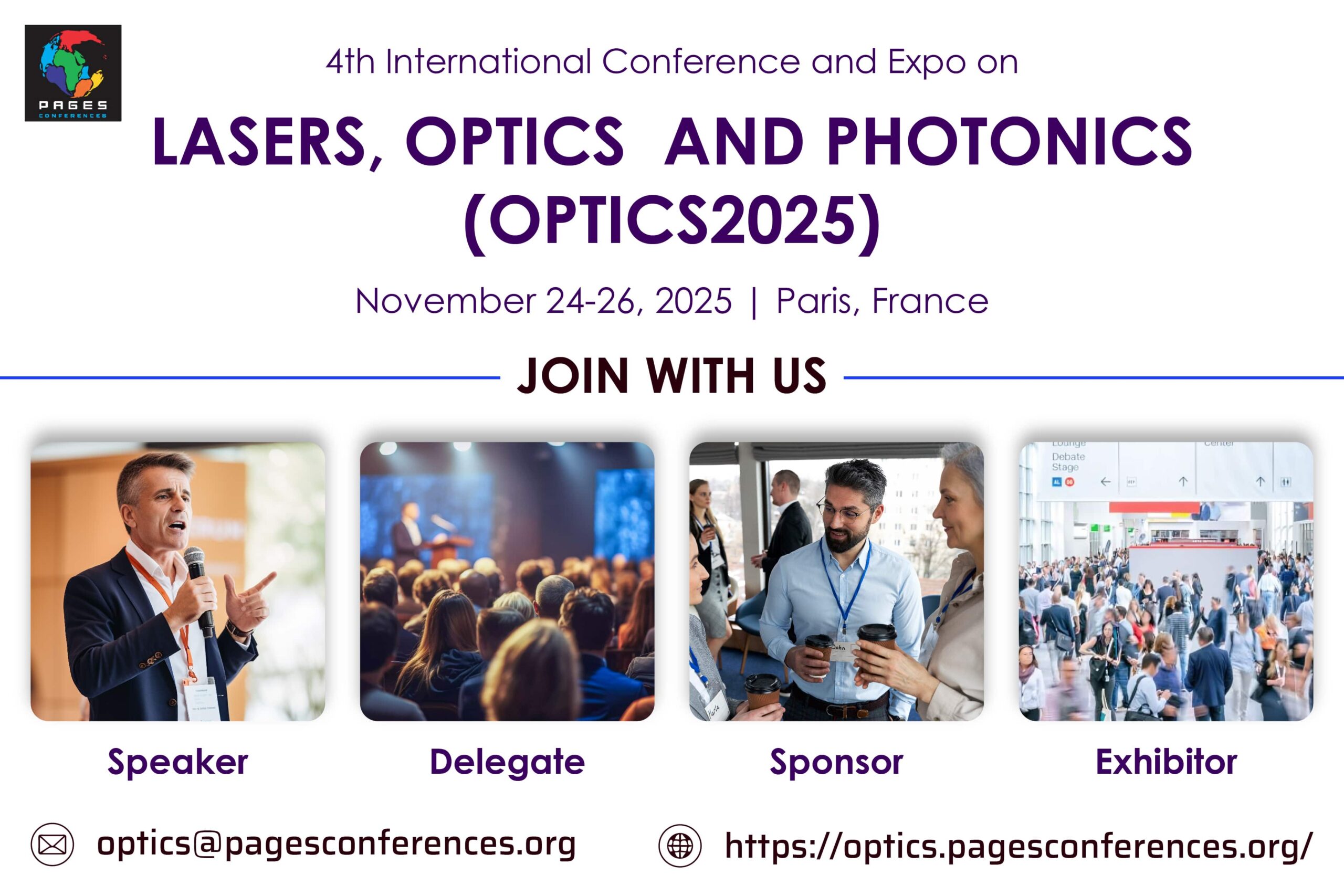 The 4th International Conference and Expo on Lasers, Optics & Photonics (OPTICS2025) will be held during November 24-26, 2025, in Paris, France. OPTICS is an established event, attracting global participants intent on sharing, exchanging, and exploring new avenues of lasers, optics, and photonics-related research and latest developments. The event will feature world-class (highly cited) Plenary Speakers, established Keynote Speakers, active Invited Speakers, and fresh Contributed Speakers. Additionally, a variety of poster presentations, workshops, and special sessions will engage the audience.